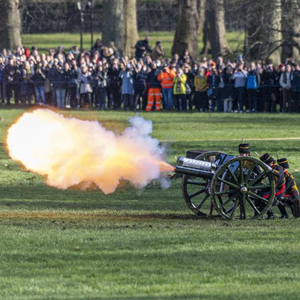 2月7日,英國士兵在倫敦白金漢宮旁的格林公園鳴放禮炮,慶祝女王伊麗莎白二世登基70周年。