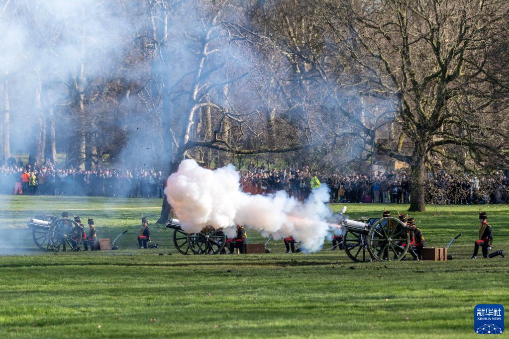 2月7日,英國士兵在倫敦白金漢宮旁的格林公園鳴放禮炮,慶祝女王伊麗莎白二世登基70周年。