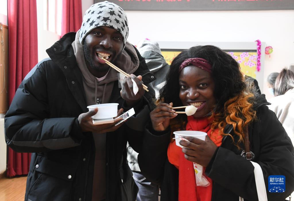 2月15日,在位于北京市海淀區中關(guān)村街道的華清園社區服務(wù)站,外國留學(xué)生在社區組織的慶元宵活動(dòng)中品嘗湯圓。