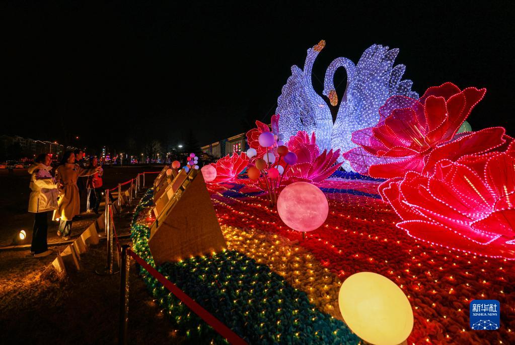 2月14日,在山東省榮成市櫻花湖體育公園,市民們在觀(guān)賞“天鵝花燈”。