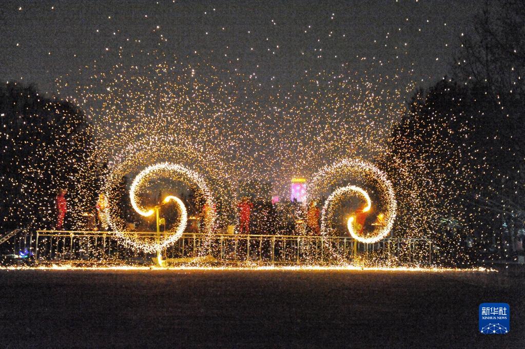 2月14日,在河南省洛陽(yáng)市洛龍區隋唐城遺址植物園,民俗藝人為市民、游客表演“打鐵花”,喜迎元宵佳節。