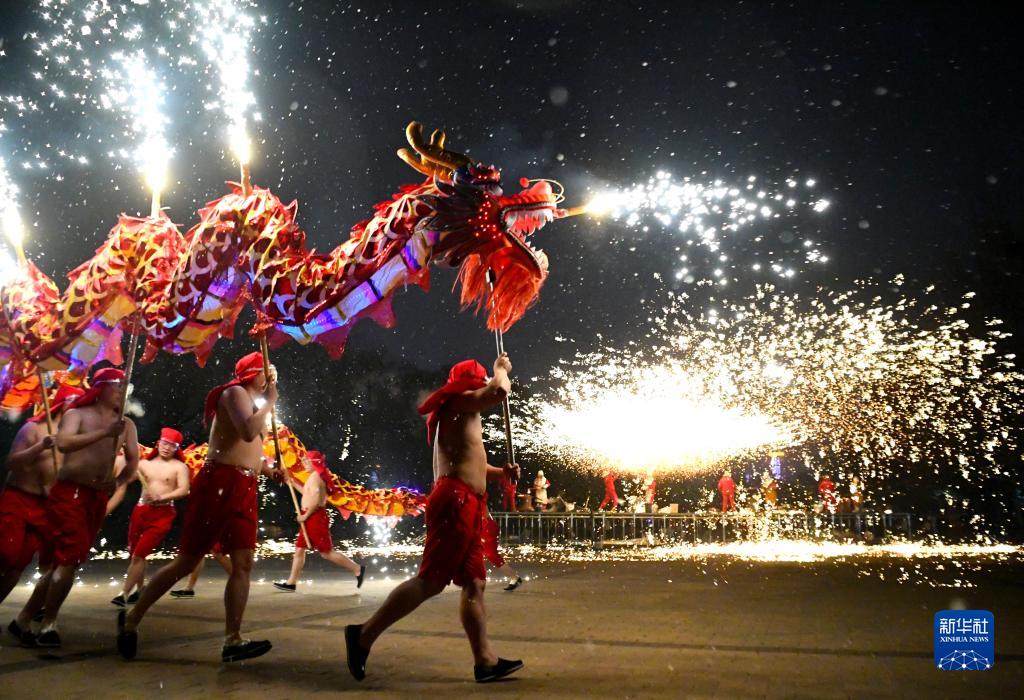 2月14日,在河南省洛陽(yáng)市洛龍區隋唐城遺址植物園,民俗藝人為市民、游客表演舞龍和“打鐵花”,喜迎元宵佳節。
