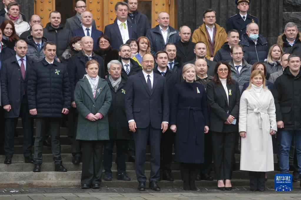 2月16日,在烏克蘭首都基輔,烏克蘭內閣成員在烏政府辦公大樓前參加團結日慶?;顒?dòng)。