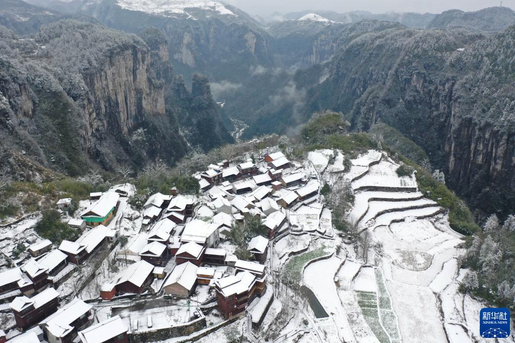 2月21日拍攝的湖南省湘西土家族苗族自治州吉首市矮寨鎮排兄村雪景(無(wú)人機照片)。