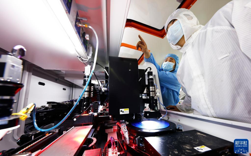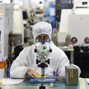 2月23日,在泗洪經(jīng)濟開(kāi)發(fā)區一電子企業(yè)生產(chǎn)車(chē)間內,工人生產(chǎn)出口的芯片。