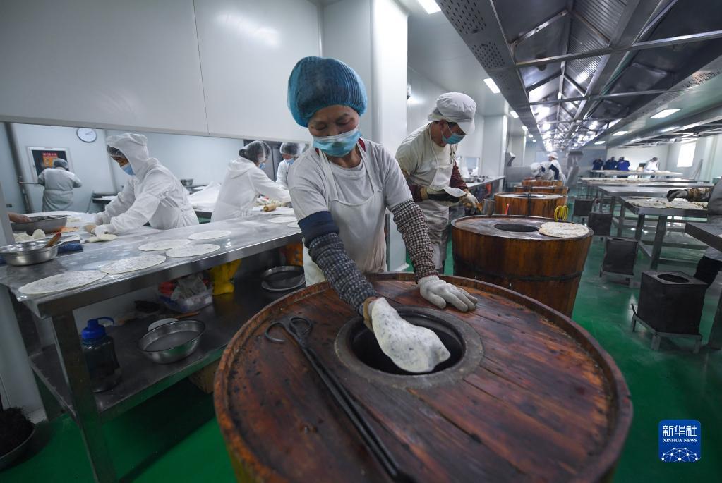 2月24日,在杭州市淳安縣臨岐鎮秋念餅業(yè)工廠(chǎng),工人在用傳統烘烤桶烘制當地特色美食——梅干菜餅。