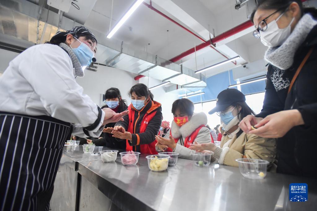 2月24日,在湘潭市雨湖區人力資源和社會(huì )保障服務(wù)中心,老師(左一)在面點(diǎn)師培訓班上教學(xué)員制作湯圓。