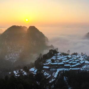 2月24日早上拍攝的湖南省湘西土家族苗族自治州花垣縣雙龍鎮十八洞村雪后日出(無(wú)人機照片)。
