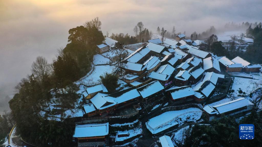 2月24日早上拍攝的湖南省湘西土家族苗族自治州花垣縣雙龍鎮十八洞村雪后日出(無(wú)人機照片)。