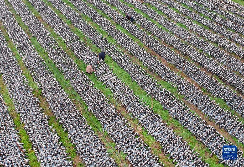 2月23日,在福建省南平市建陽(yáng)區徐市鎮北岸村的大風(fēng)車(chē)食用菌農產(chǎn)品采摘基地,農戶(hù)在黑木耳種植田間作業(yè)(無(wú)人機照片)。