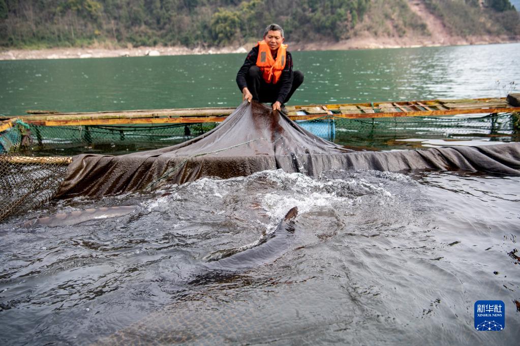 2月25日,三峽庫區珍稀魚(yú)類(lèi)馴養基地工作人員在查看長(cháng)江鱘的生長(cháng)情況。