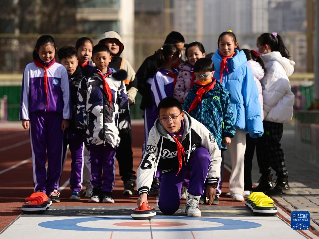 3月1日,西寧市城西區文匯小學(xué)學(xué)生在校園里體驗旱地冰壺。