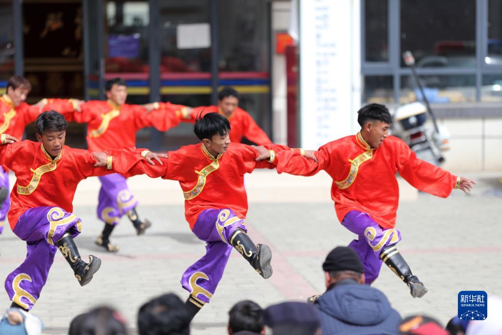 搬遷牧民在搬遷點(diǎn)廣場(chǎng)上跳起民族舞蹈,迎接藏歷新年(2月28日攝)。