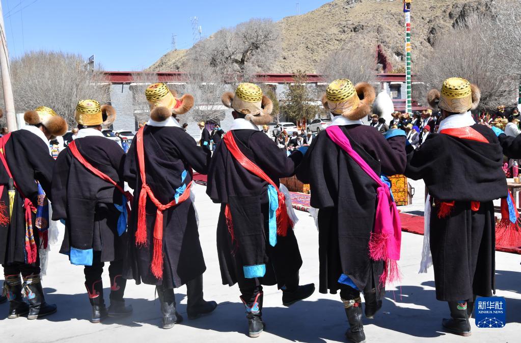 3月3日,西藏山南市貢嘎縣崗堆鎮農民穿著(zhù)嶄新的氆氌藏裝參加藏歷新年活動(dòng)。
