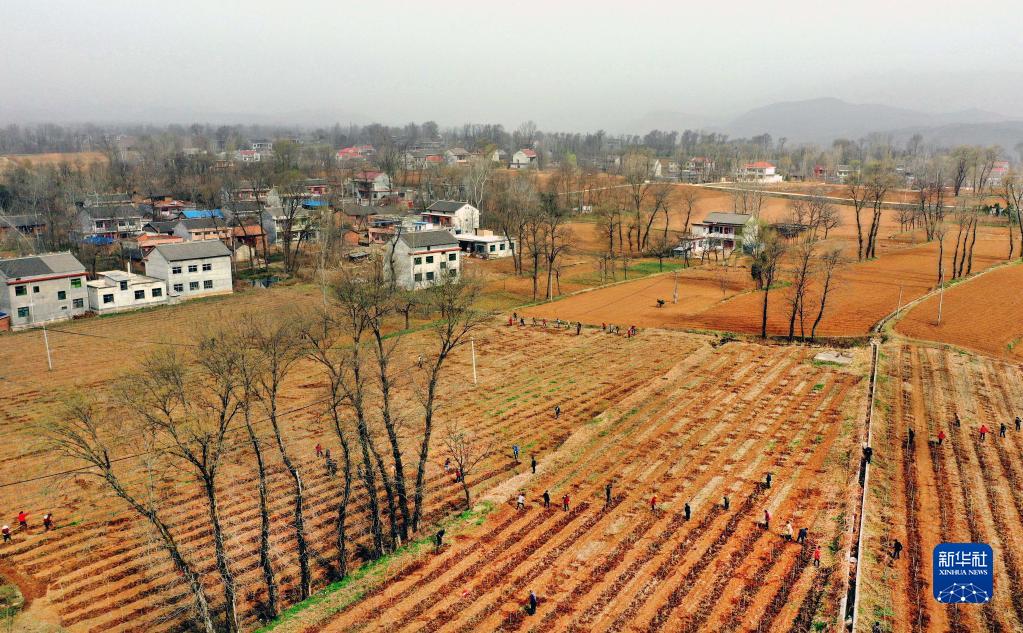 3月14日,洛南縣永豐鎮席塬村村民在栽種樹(shù)苗(無(wú)人機照片)。