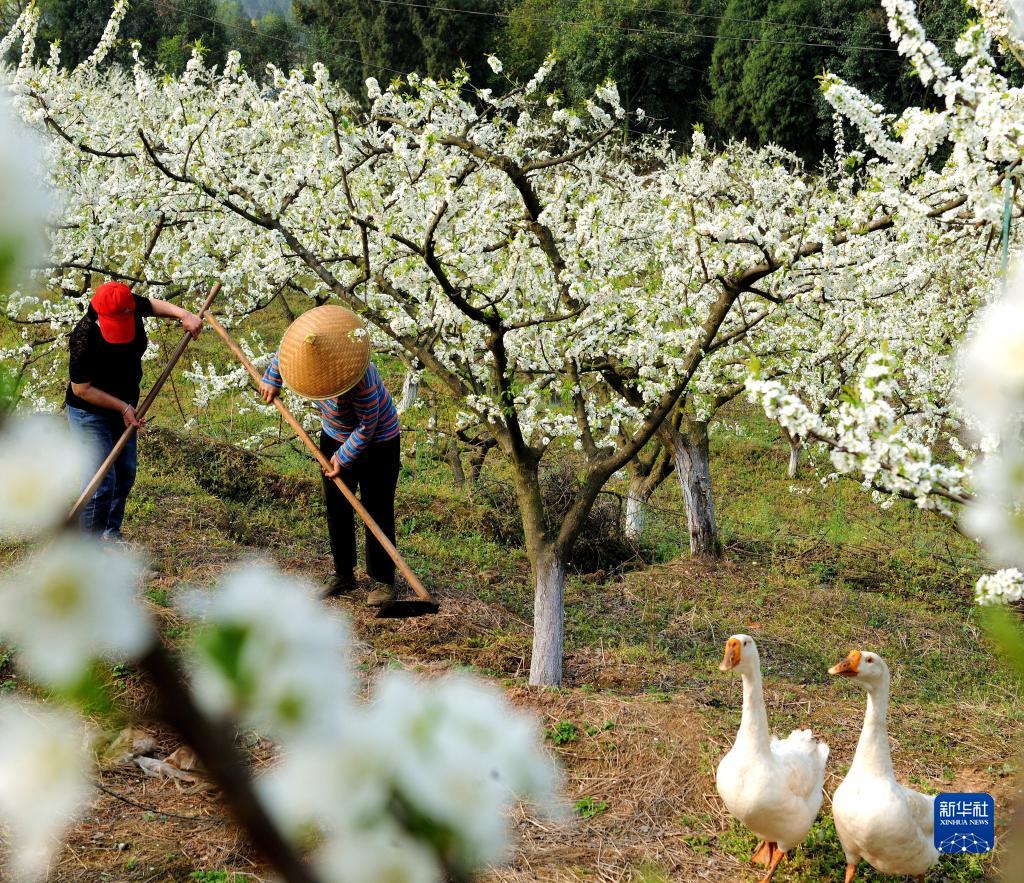 3月15日,四川省中江縣富興鎮柳林溝村李子農場(chǎng)員工在除草。