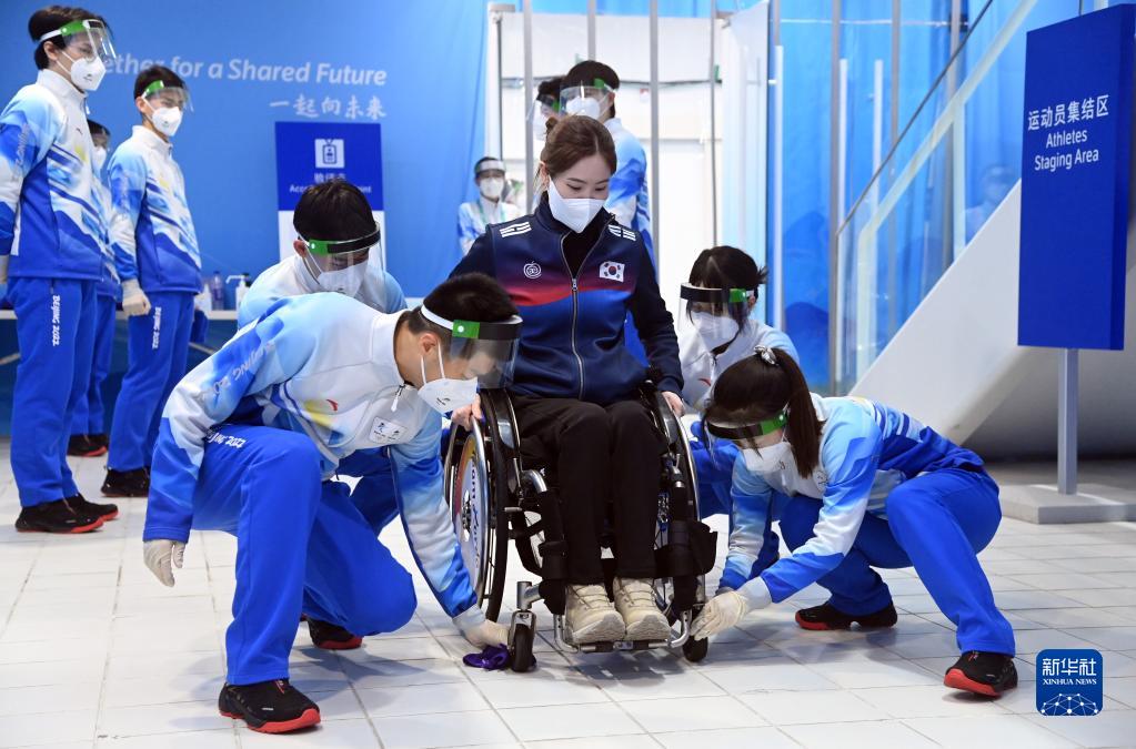 在國家游泳中心“冰立方”舉行的北京2022年冬殘奧會(huì )輪椅冰壺比賽前,志愿者們?yōu)轫n國選手白慧珍清潔輪椅(2022年3月6日攝)。