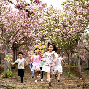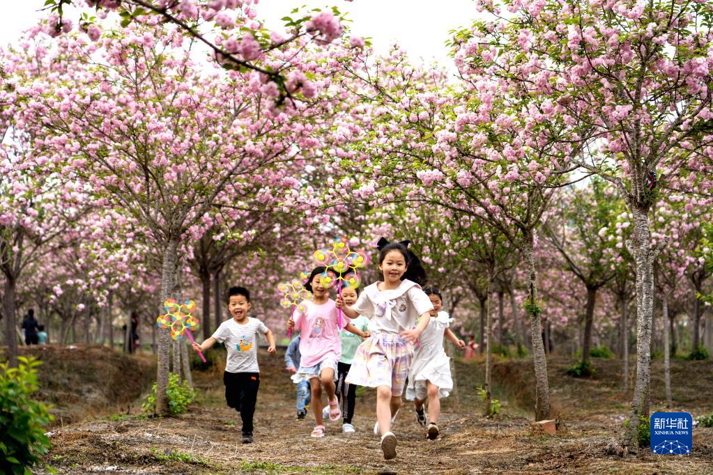 3月19日,在四川省眉山市仁壽縣方家鎮曲江社區的櫻花園里,小朋友們在開(kāi)心玩耍。