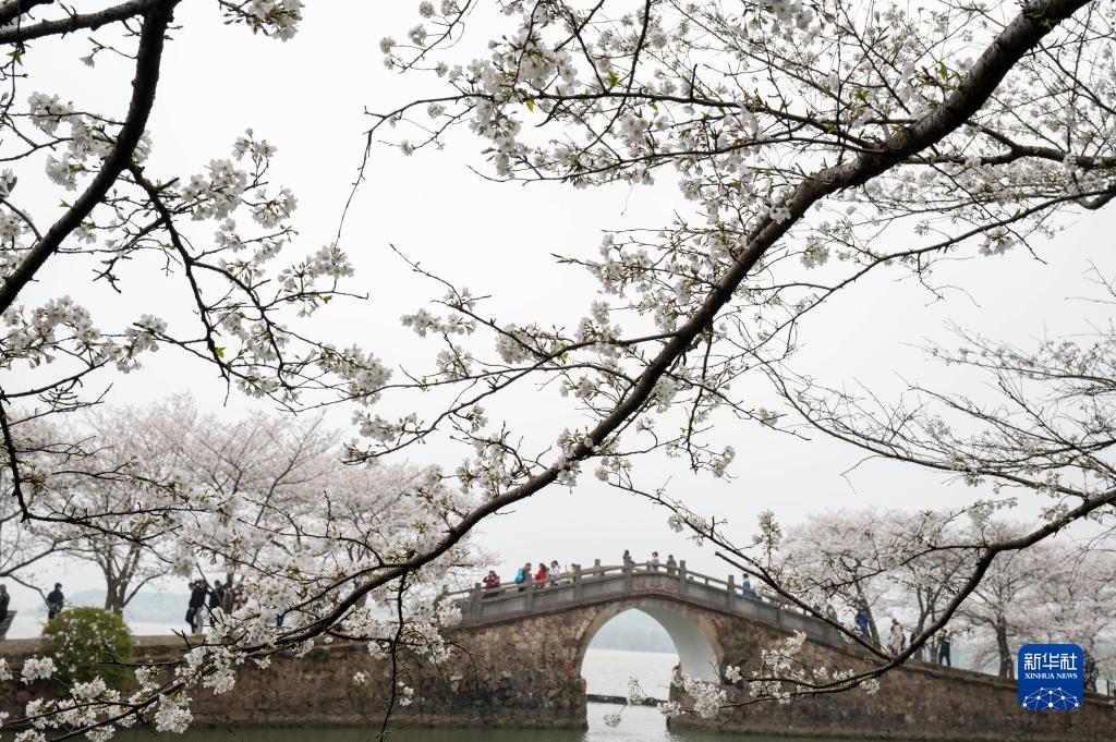 3月19日,游客在江蘇省無(wú)錫市太湖黿頭渚景區欣賞盛開(kāi)的櫻花。