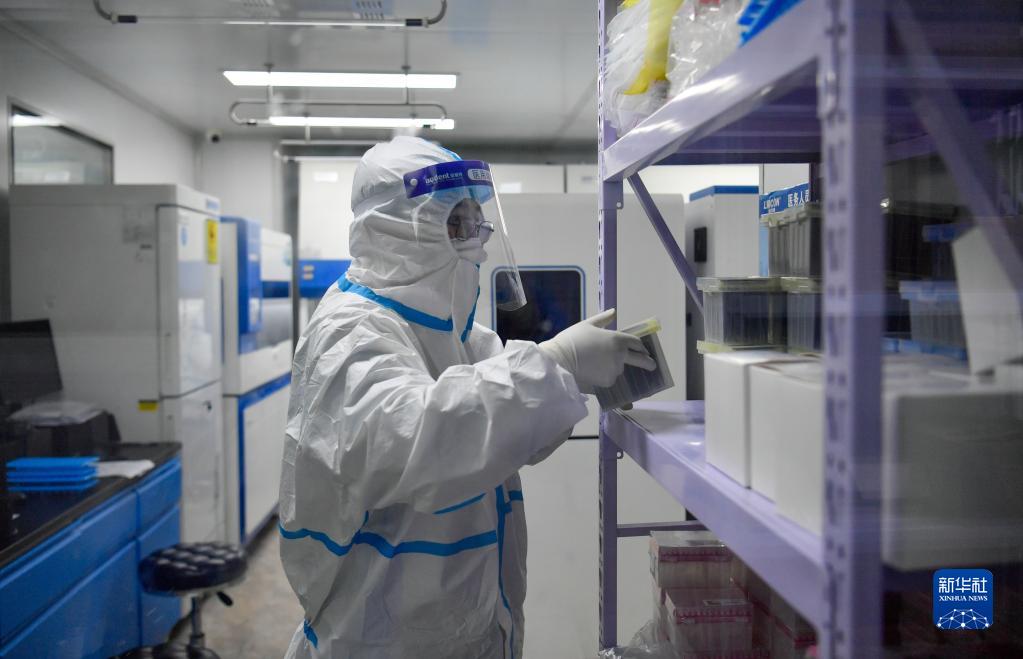 3月19日,在天津市河北區城市核酸檢測基地內,工作人員在標本制備區作業(yè)。