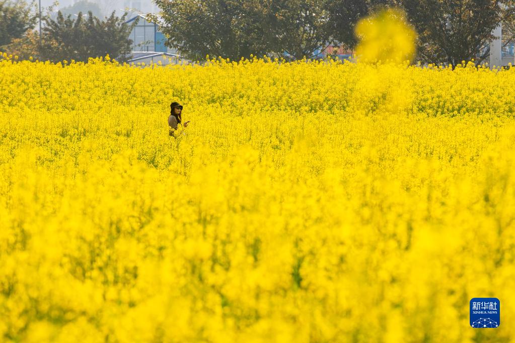 3月8日,游客在重慶市大足區中央城市花海公園的油菜花田游玩,該片油菜花田均為“慶油系列”油菜品種(無(wú)人機照片)。