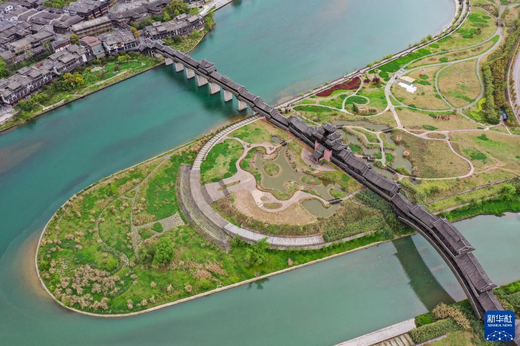 這是3月22日拍攝的重慶市黔江區濯水古鎮景區內的風(fēng)雨廊橋(無(wú)人機照片)。