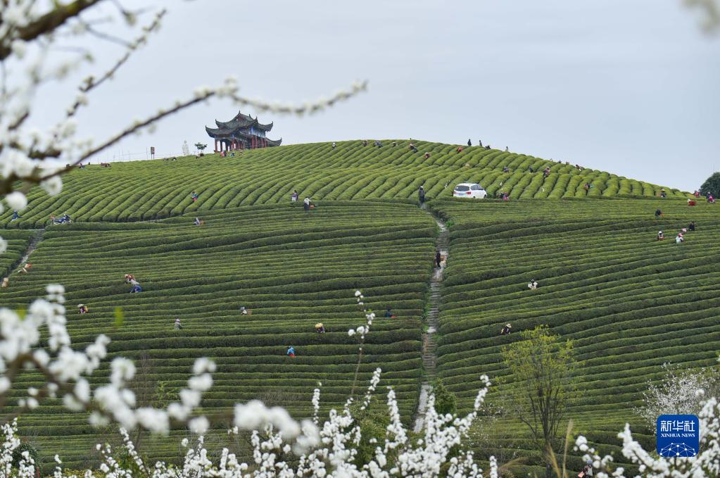 3月24日,茶農在貴州省銅仁市松桃苗族自治縣正大鎮茶園采摘明前茶。