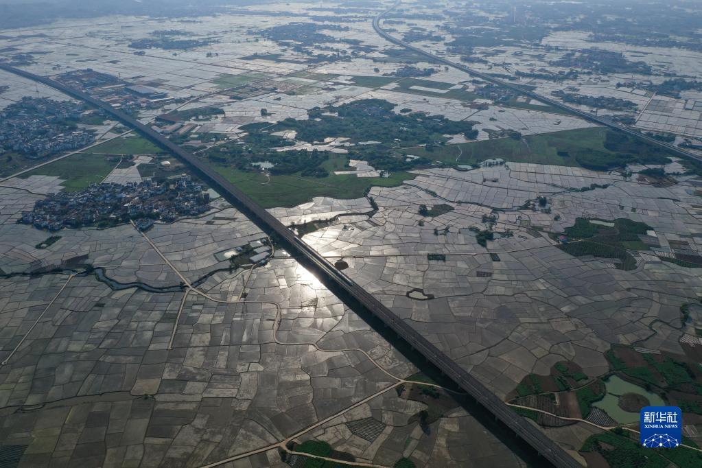 一列動(dòng)車(chē)組列車(chē)在廣西南寧市賓陽(yáng)縣古辣鎮的田野上行駛(4月4日攝,無(wú)人機照片)。
