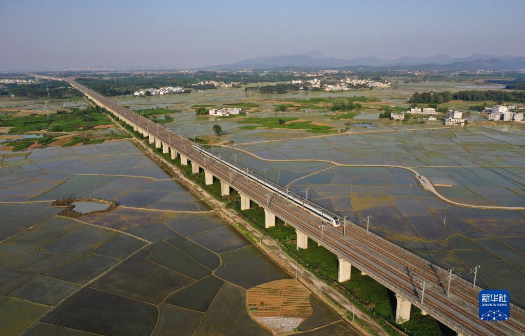 一列動(dòng)車(chē)組列車(chē)在廣西南寧市賓陽(yáng)縣古辣鎮的田野上行駛(4月4日攝,無(wú)人機照片)。