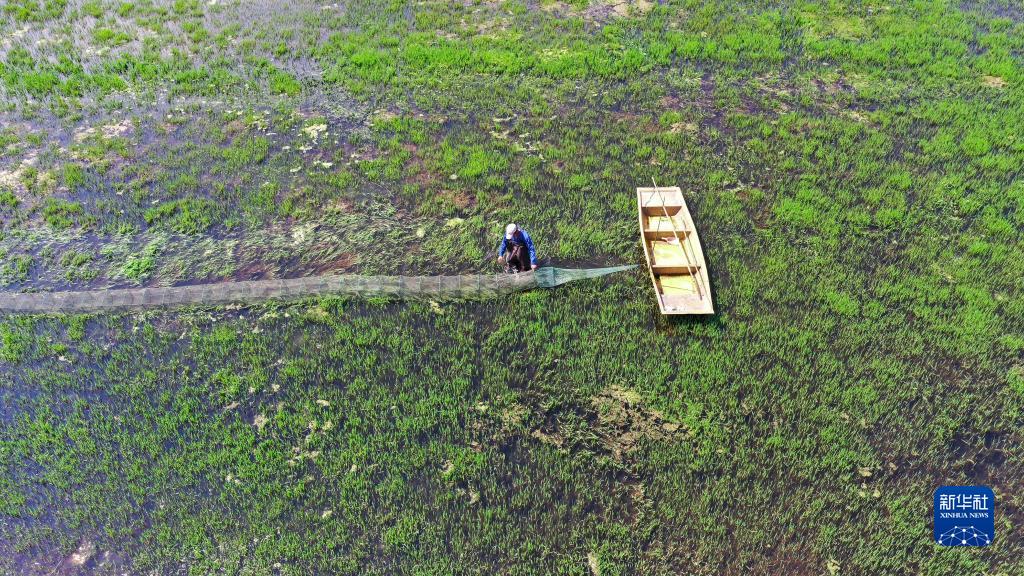 4月6日 ,在湖南省衡陽(yáng)市常寧市板橋鎮新橋村,農民在稻蝦共養稻田里整理小龍蝦蝦籠(無(wú)人機照片)。