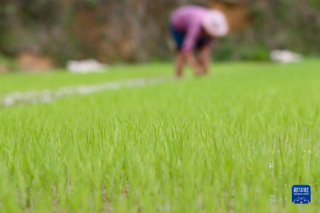 4月10日,村民在貴州省黔東南苗族侗族自治州岑鞏縣天星鄉地城村管護秧苗。
