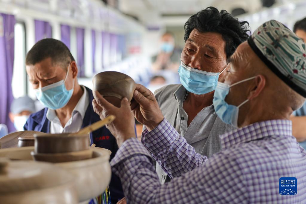 乘客在“和田玉龍號”列車(chē)的“流動(dòng)巴扎”挑選手工木制品(4月28日攝)。