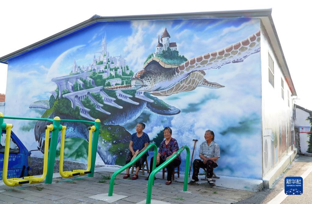 8月3日,北張村村民在墻繪藝術(shù)畫(huà)前休憩。