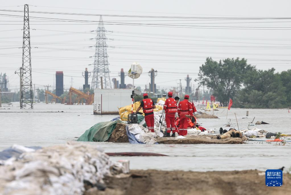 8月3日,參與搶險的工作人員在遼寧省盤(pán)錦市繞陽(yáng)河左岸曙四聯(lián)段潰口處監測險情。