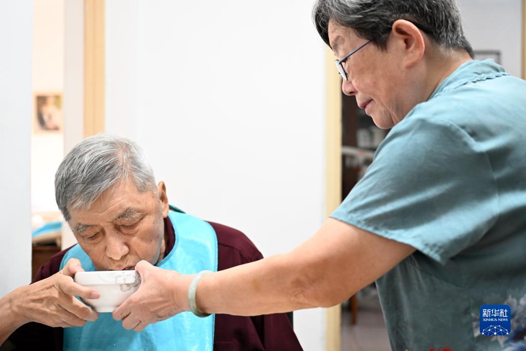 段肇誼(右)幫助顧偉力端碗吃早飯(7月26日攝)。