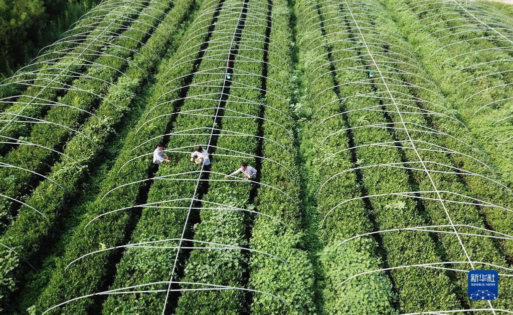 8月3日,在山東省泰安市岱岳區道朗鎮,茶農采摘夏茶(無(wú)人機照片)。