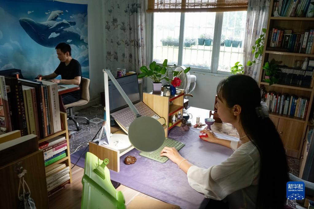 在四川省什邡市馬井鎮同心村,王忠禮和宇曉在家中工作(8月2日攝)。