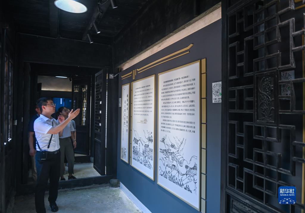 8月5日,黨員志愿者(前)為參觀(guān)者介紹“文瀾閣《四庫全書(shū)》抗戰西遷首站研學(xué)中心”。