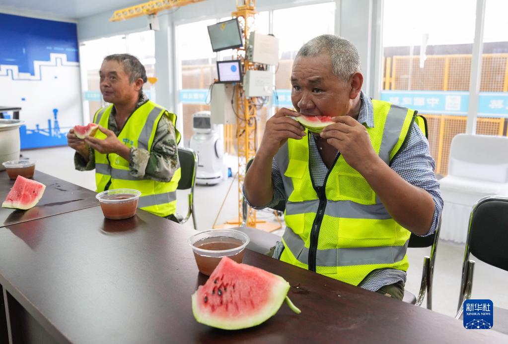 8月5日,在位于上海的一項目工地工友服務(wù)點(diǎn),中建三局華東公司上海分公司的工人在吃西瓜消暑。