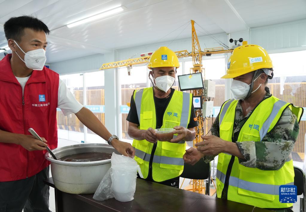 8月5日,在位于上海的一項目工地工友服務(wù)點(diǎn),中建三局華東公司上海分公司的工人在領(lǐng)取綠豆湯。