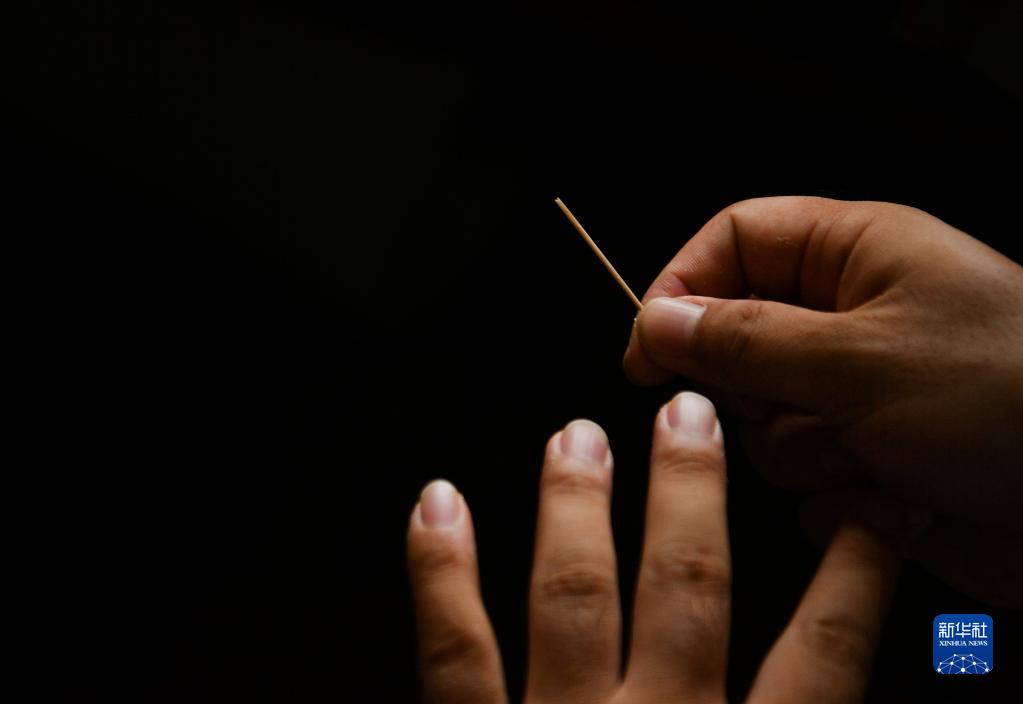 8月6日,考古人員展示一枚陜西神木石峁遺址皇城臺出土的骨針。