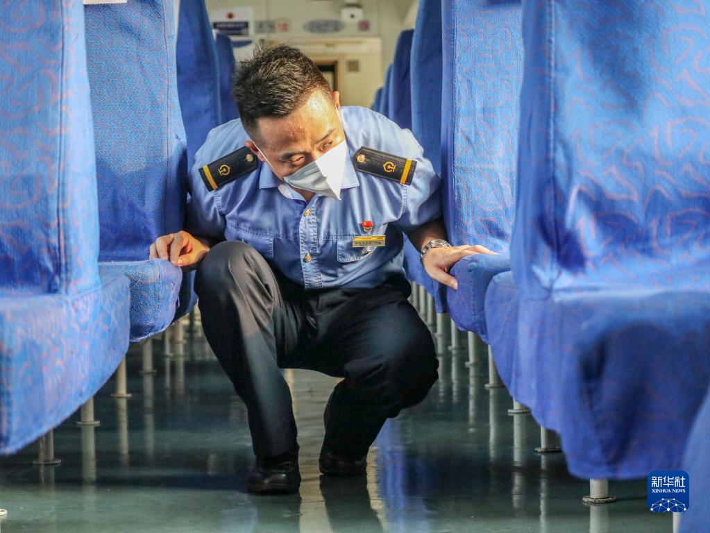 8月5日,在重慶西客車(chē)整備所,守車(chē)車(chē)長(cháng)丁璐在庫內對K1153次列車(chē)全列隱蔽部位進(jìn)行檢查。