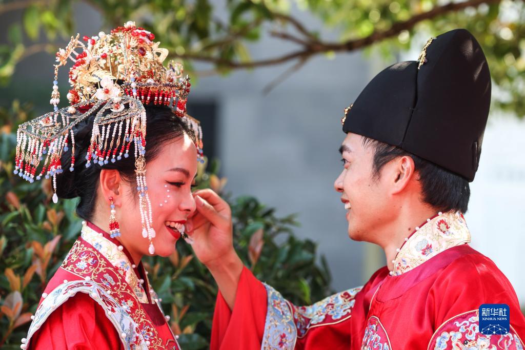 8月4日,新郎在婚禮現場(chǎng)為新娘整理發(fā)飾。8月4日是七夕,2022(壬寅)年貴陽(yáng)孔學(xué)堂中華婚禮在貴陽(yáng)孔學(xué)堂舉辦,12對新人身穿中式婚服通過(guò)合巹禮、解纓結發(fā)、共書(shū)婚帖等方式完成傳統婚禮儀式。