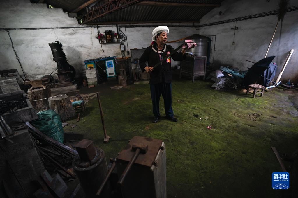 62歲的阿昌族男子項老賽是戶(hù)撒鄉本地人,14歲師從父親制刀,至今已有四十余年,現在是國家級非物質(zhì)文化遺產(chǎn)——阿昌族戶(hù)撒刀鍛制技藝國家級代表性傳承人。