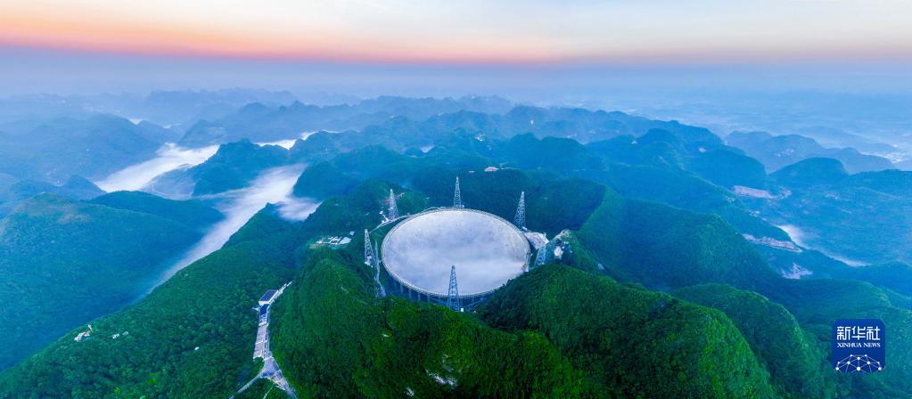 晨曦中的“中國天眼”全景(無(wú)人機照片,2022年7月25日維護保養期間拍攝)。