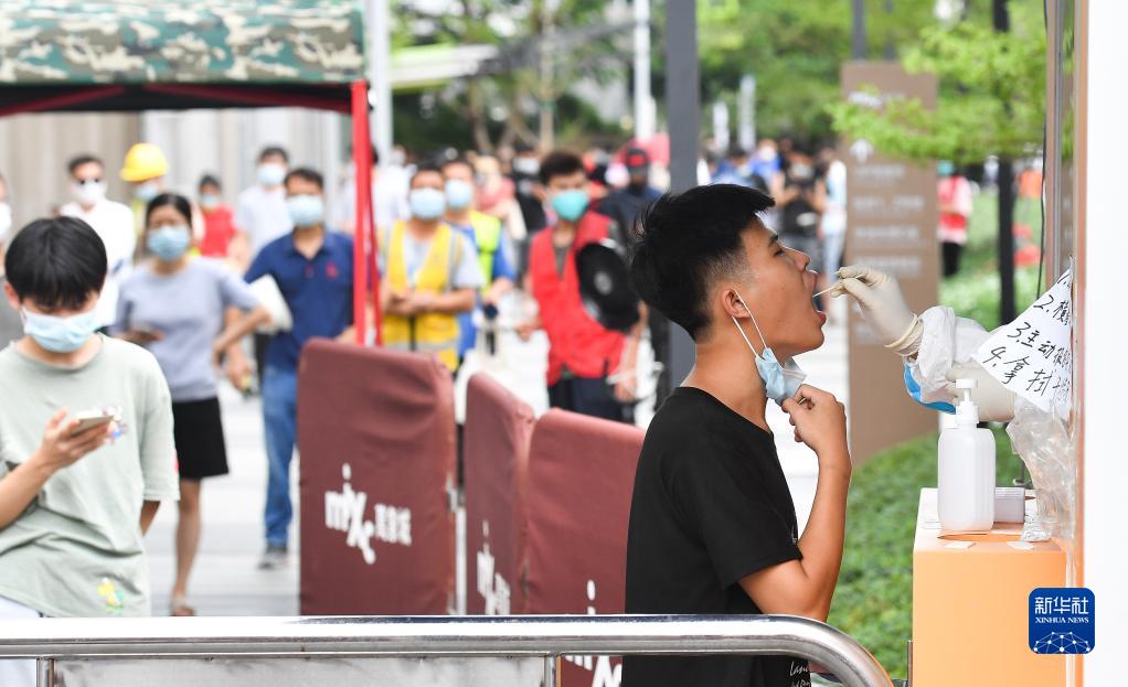 8月7日,居民在??谑旋埲A區萬(wàn)象城采樣點(diǎn)進(jìn)行核酸檢測。