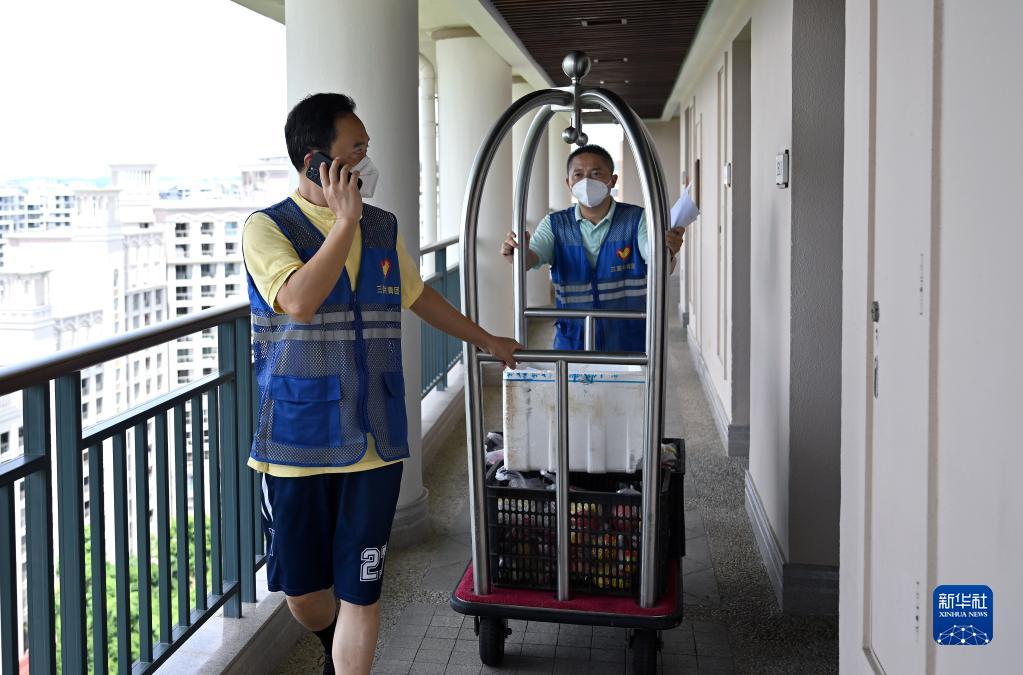 8月7日,志愿者在三亞一家酒店為游客運送水果。