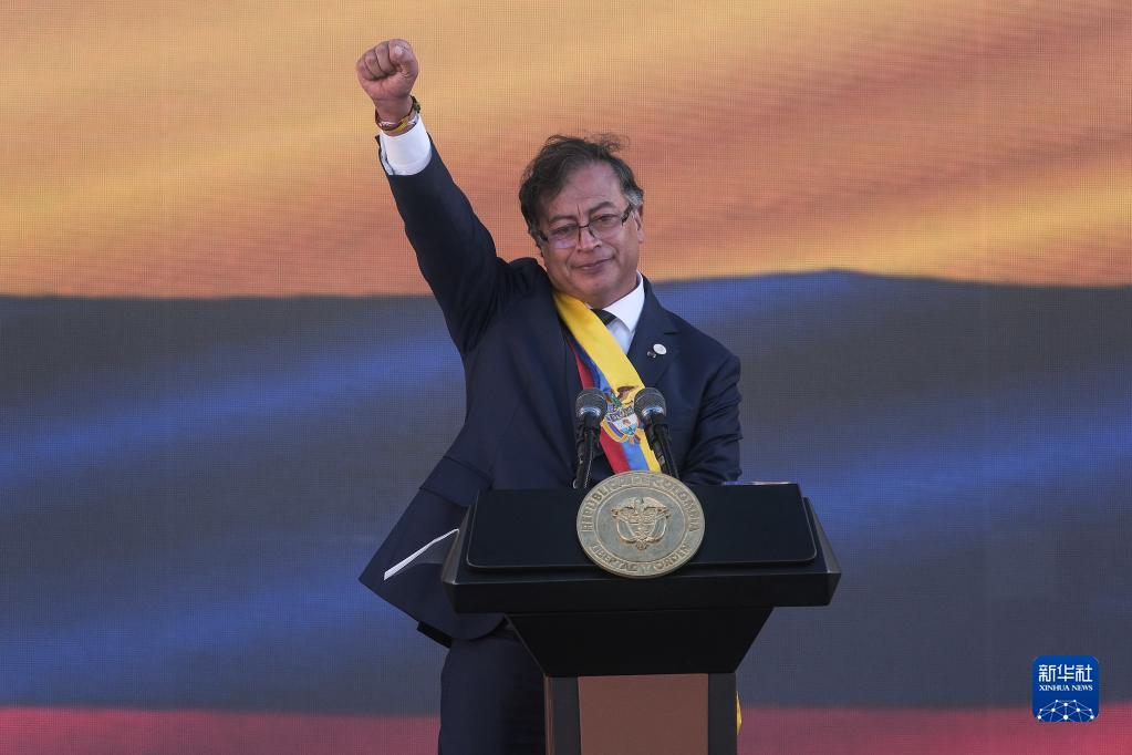 哥倫比亞當選總統古斯塔沃·佩特羅7日在首都波哥大玻利瓦爾廣場(chǎng)宣誓就職。