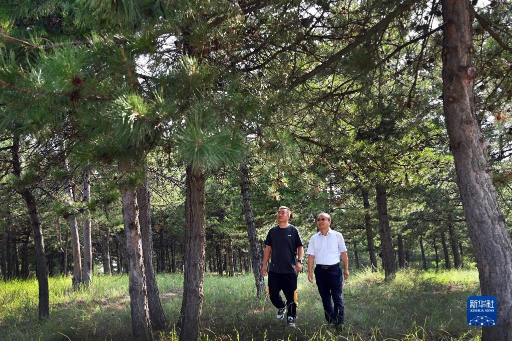 神木市林業(yè)局森林巡察人員在水磨河林場(chǎng)國有林地巡查高溫防火情況(8月1日攝)。