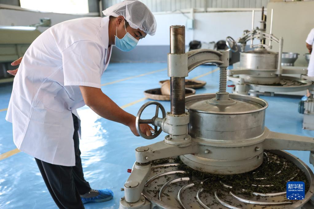 8月9日,工作人員在石阡縣楓香鄉梨子園村茶葉加工廠(chǎng)內對茶青進(jìn)行揉捻。